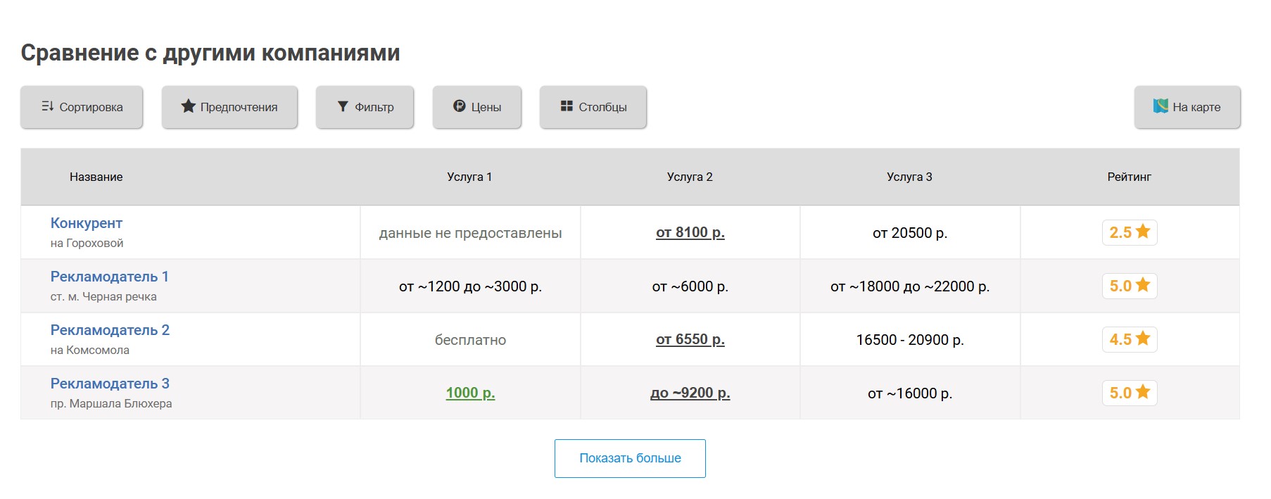 Вокруг продвигаемой таким образом школы выбирается некоторое количество ближайших конкурирующих школ, продвигаемая школа попадёт к ним в таблицу «Сравнение по ценам», которая выглядит следующим образом: